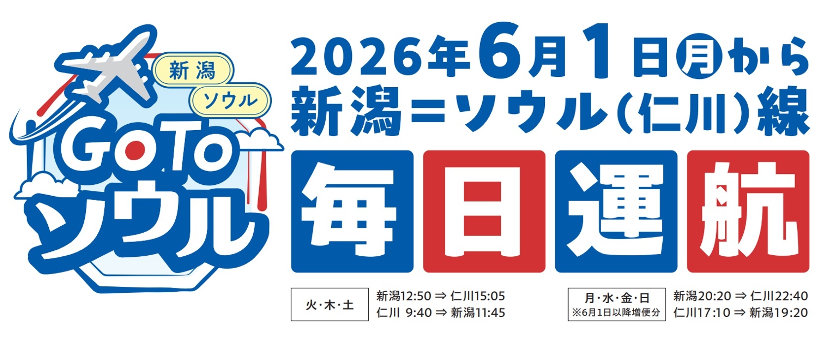 현재 대한항공이 주 3편으로 운항하고 있는 '니가타-인천(서울) 노선'이 6월 1일부터 주 7편으로 증편돼 매일 운항되는 것이 결정된바, 안내드립니다.